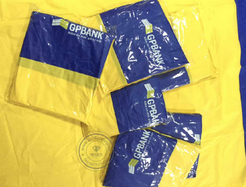Hiện nay, quảng bá thương hiệu bằng áo mưa quảng cáo được rất nhiều doanh nghiệp sử dụng như một chiến thuật PR hiệu quả. Bằng cách in ấn logo, tên công ty, slogan lên áo mưa, nhiều doanh nghiệp đã thành công trong việc tạo sự nhận diện thương hiệu và khẳng định vị thế của mình. Áo mưa GPbank sản xuất trên chất liệu vải nhựa PVC Rạng Đông, In logo 1 màu 2 vị trí , Mỗi áo có đựng trong 1 túi nhựa PVC có in logo 1 màu .