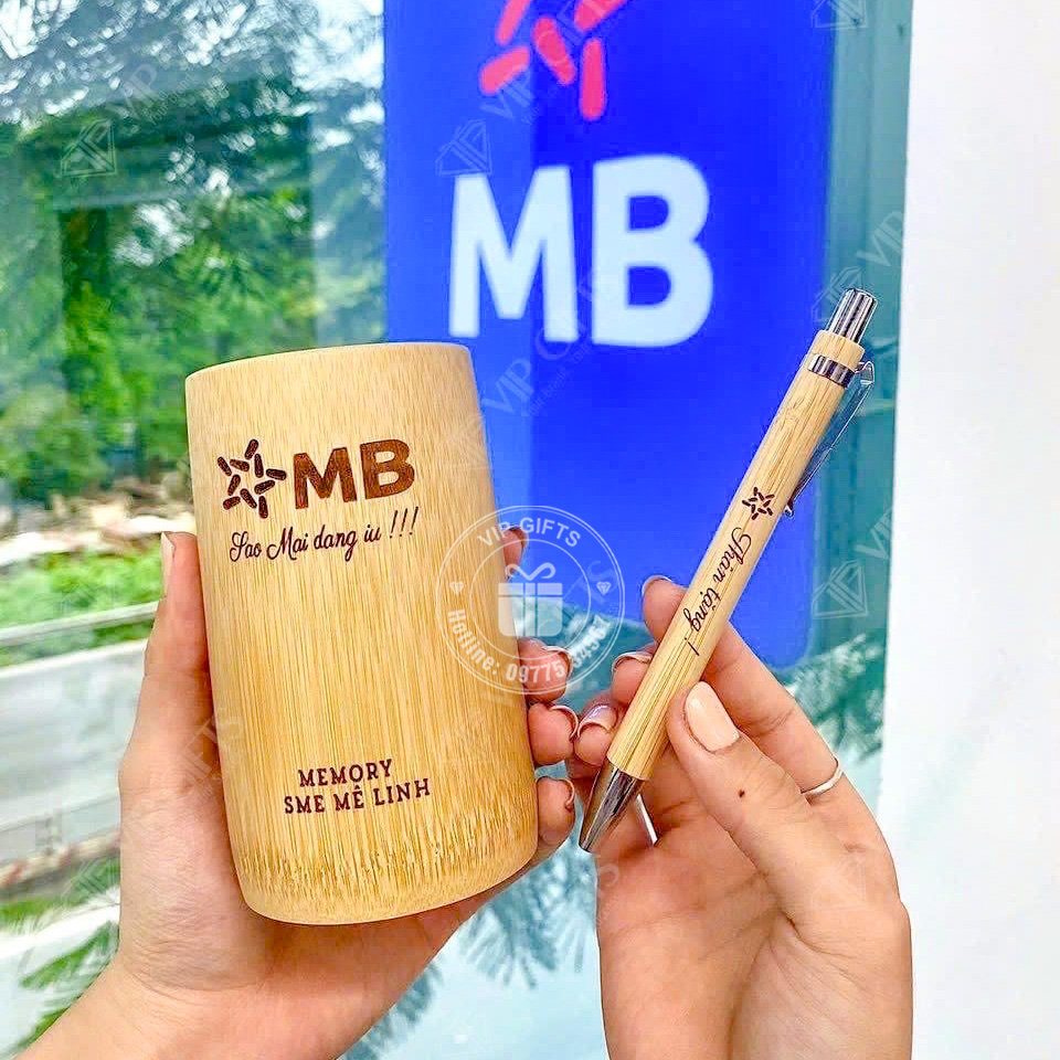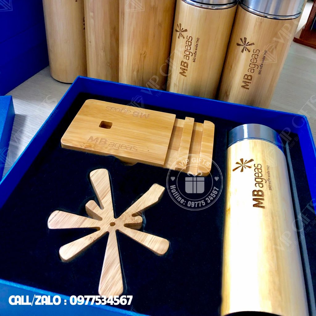 Bộ quà tặng cao cấp làm từ gỗ tre tự nhiên, bao gồm bình giữ nhiệt, đế lót ly, giá đỡ điện thoại tiện dụng, đồng hồ gỗ, cốc và bút tre. Sản phẩm mang đậm tinh thần “sống xanh”, là món quà lý tưởng cho các chiến dịch truyền thông bền vững, tri ân đối tác hoặc sự kiện doanh nghiệp theo hướng thân thiện với môi trường.
