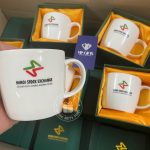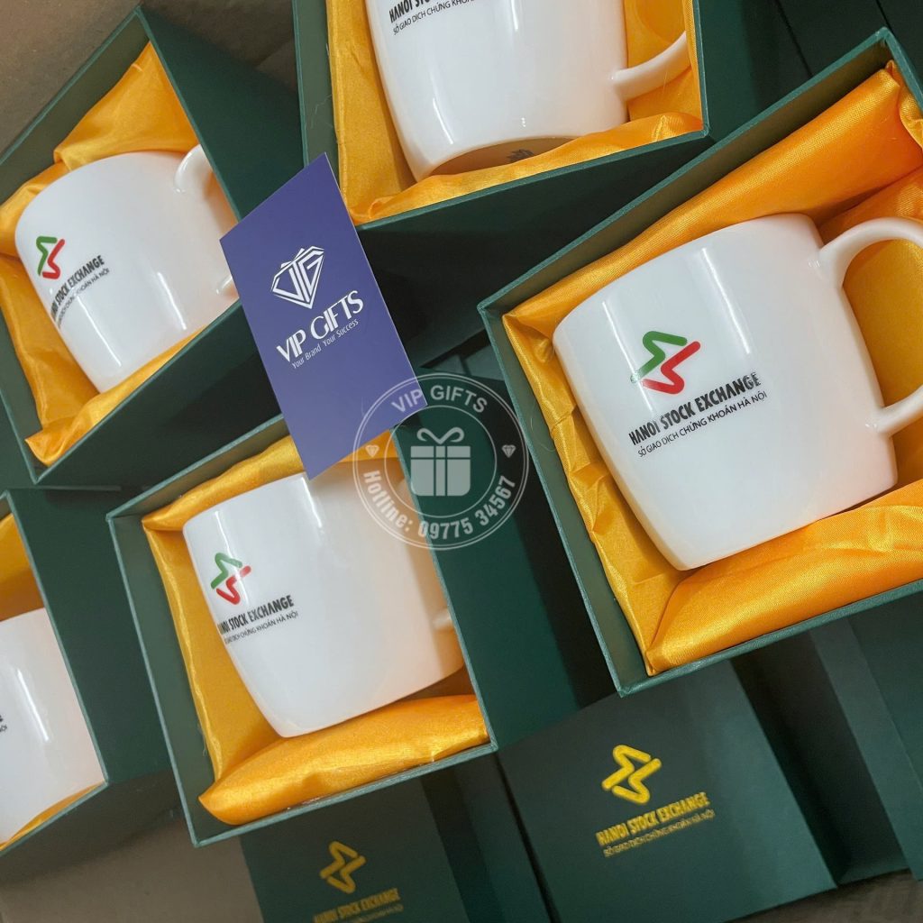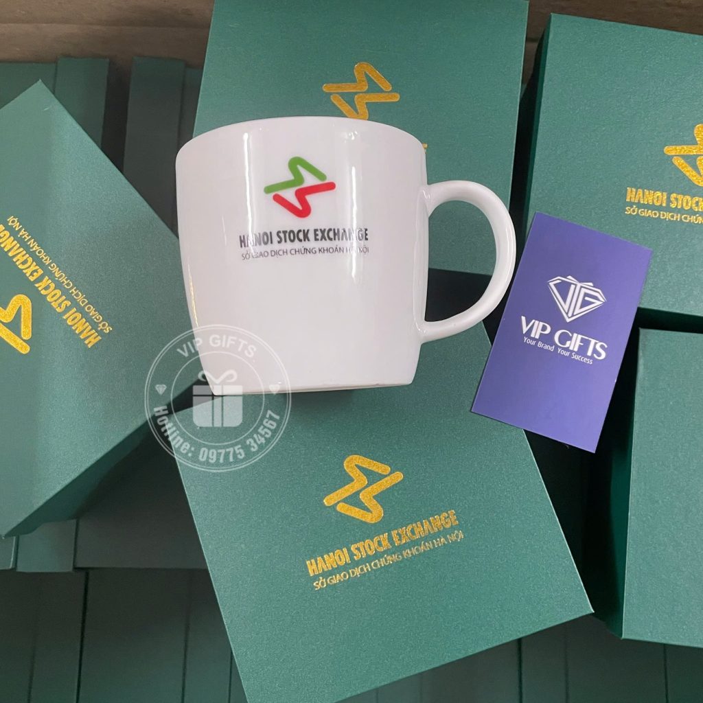 Ly sứ trắng cao cấp được in logo HANOI STOCK EXCHANGE rõ nét, sắc sảo, thể hiện sự chuyên nghiệp và đẳng cấp của đơn vị tổ chức. Sản phẩm là món quà tặng lý tưởng trong các sự kiện hội nghị, lễ kỷ niệm, tri ân khách hàng hoặc đối tác.