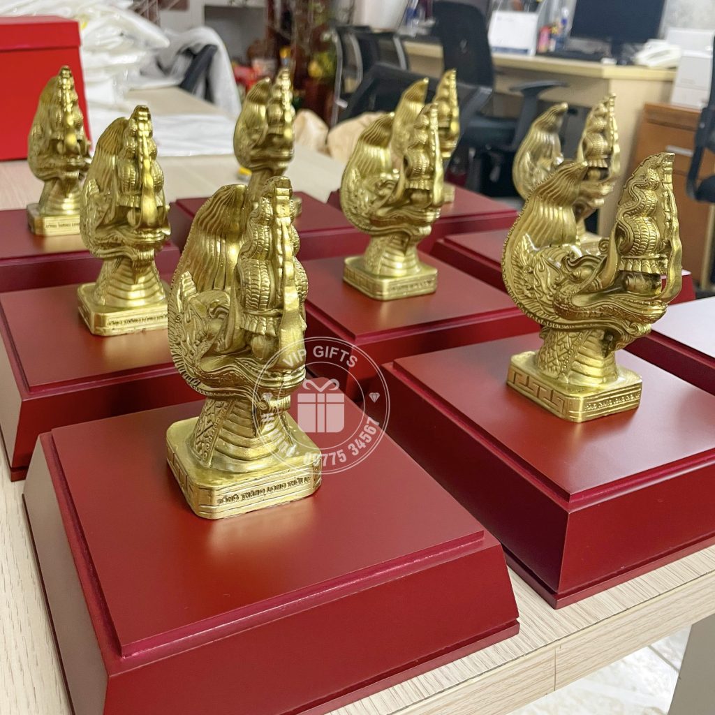 Tượng được đặt trang trọng trên đế gỗ sơn đỏ sang trọng, làm nổi bật lên sự uy nghi và quyền quý. Đây không chỉ là một món quà lưu niệm có giá trị thẩm mỹ, mà còn là biểu tượng của sự thịnh vượng, quyền lực và trí tuệ – rất phù hợp để làm quà tặng lãnh đạo, đối tác, khách hàng VIP trong các dịp đặc biệt, sự kiện quan trọng hay ngày kỷ niệm lớn.