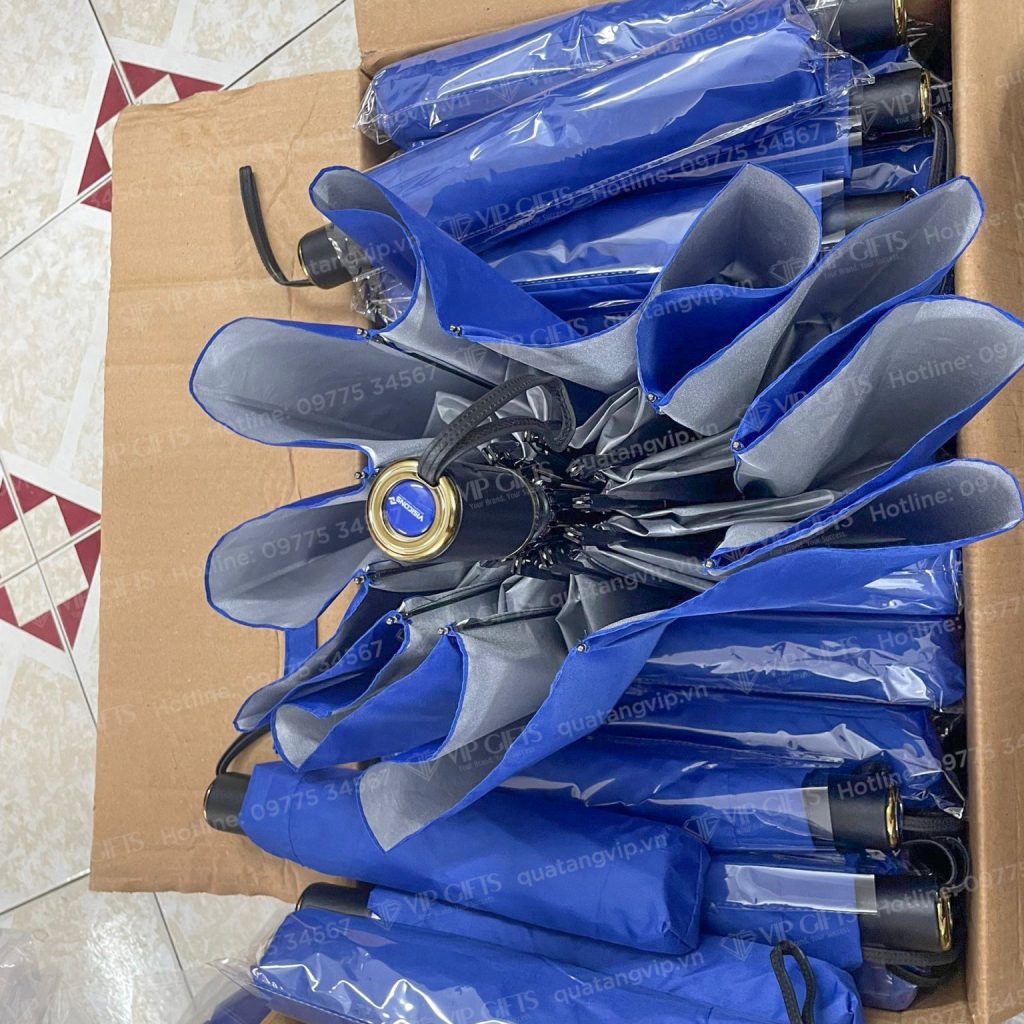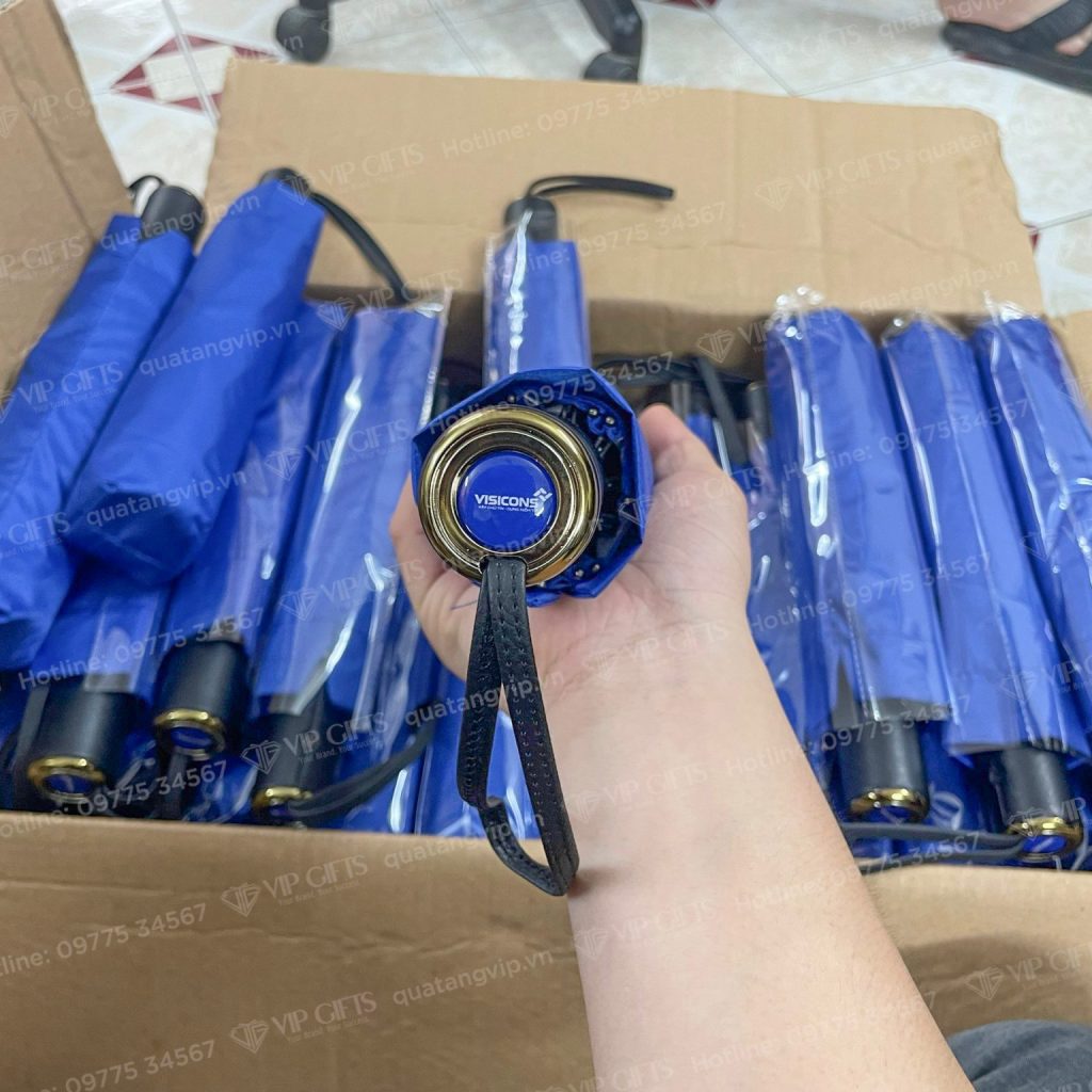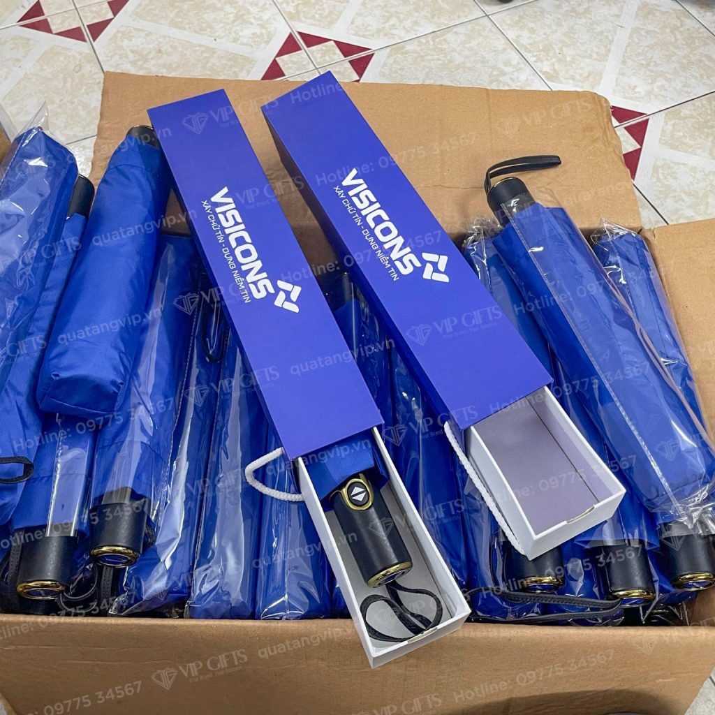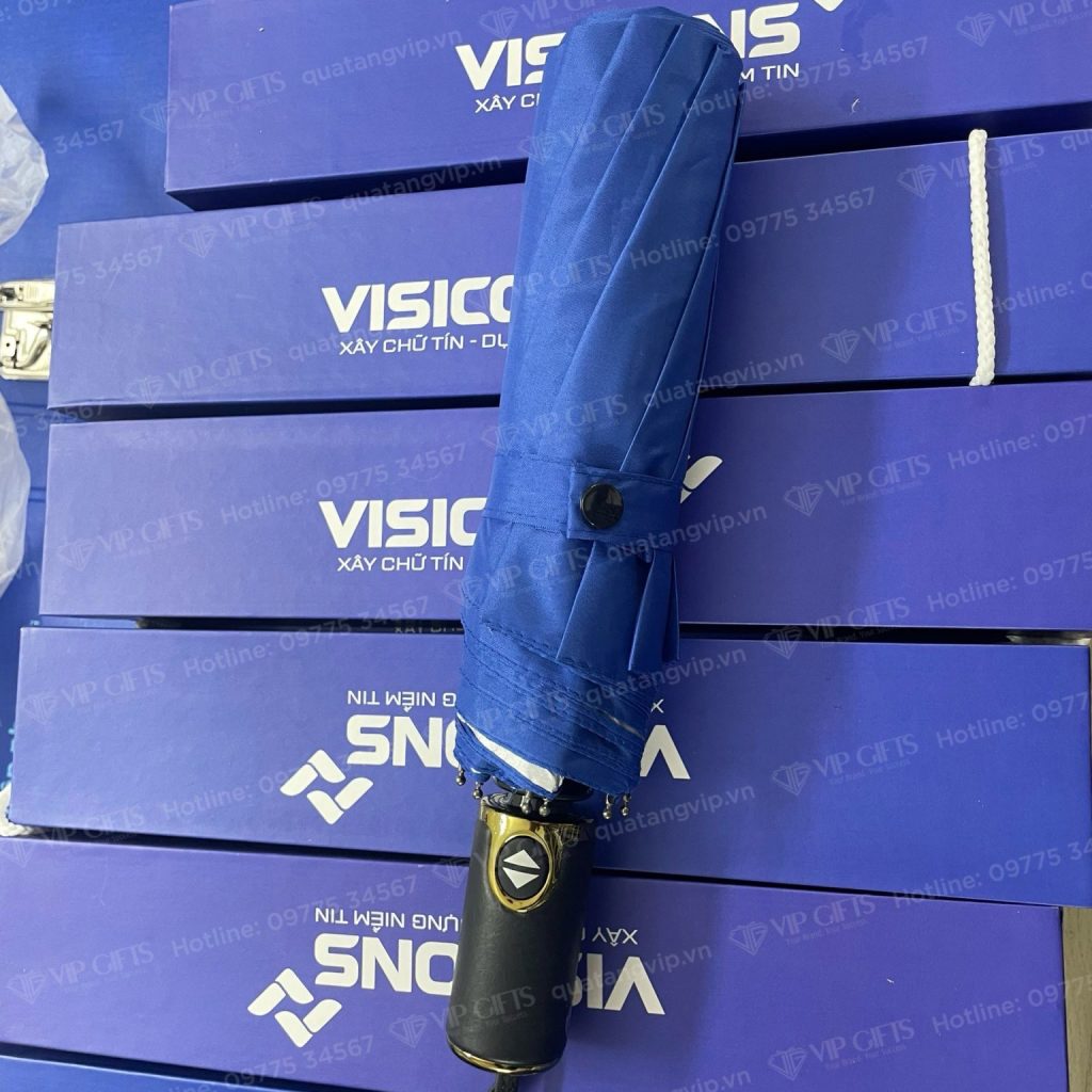 Mẫu ô gấp 3 cao cấp với gam màu xanh đặc trưng cùng logo VISICONS – Xây chữ Tín, dựng niềm Tin là lựa chọn quà tặng lý tưởng cho đối tác, khách hàng hoặc sự kiện nội bộ. Không chỉ hữu dụng trong mùa mưa nắng, sản phẩm còn góp phần lan tỏa hình ảnh doanh nghiệp một cách ấn tượng và bền bỉ.