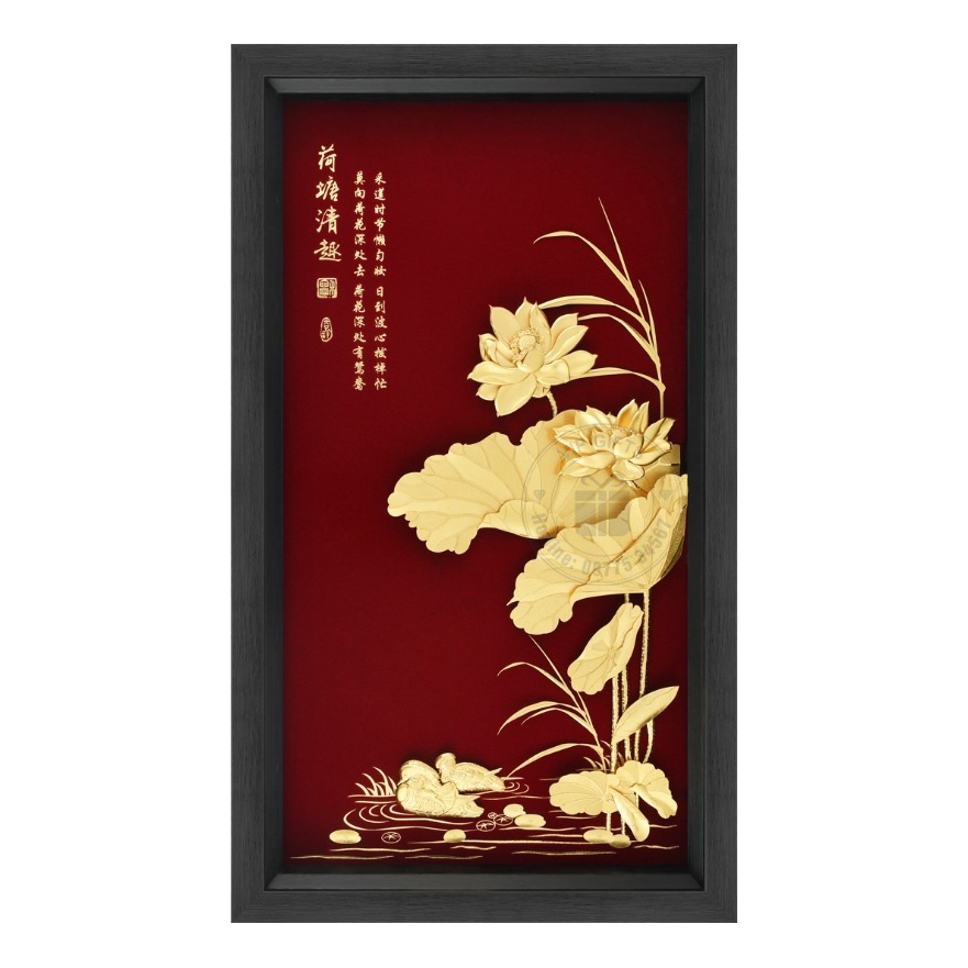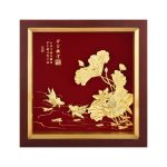 - Chất liệu quý: Được chế tác từ vàng thật 24K, kết hợp với khung gỗ cao cấp và nền nhung hoặc da sang trọng.