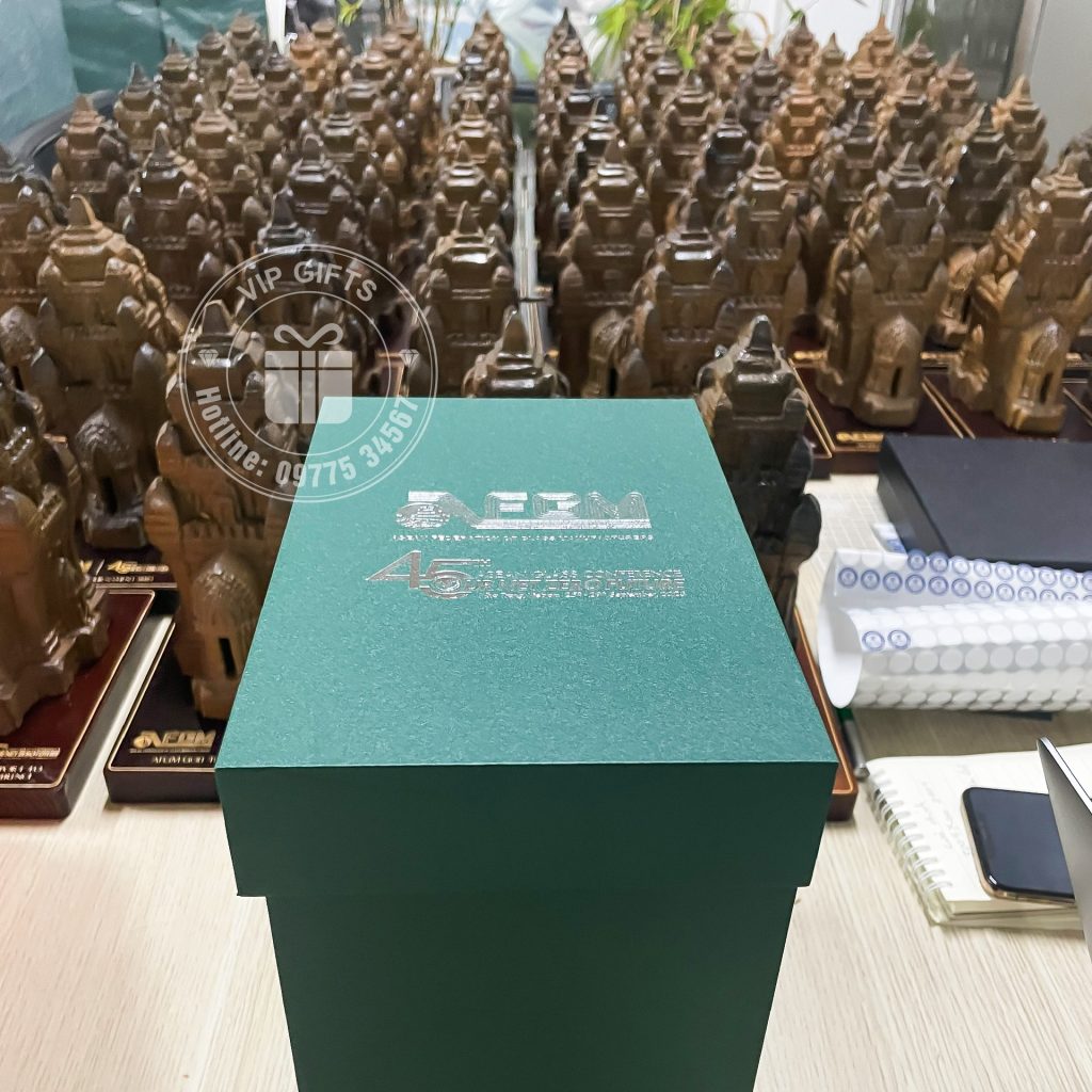 - Phần đế khắc laser logo sự kiện và thông điệp tri ân bằng tiếng Anh, tạo sự trang trọng, chuyên nghiệp.